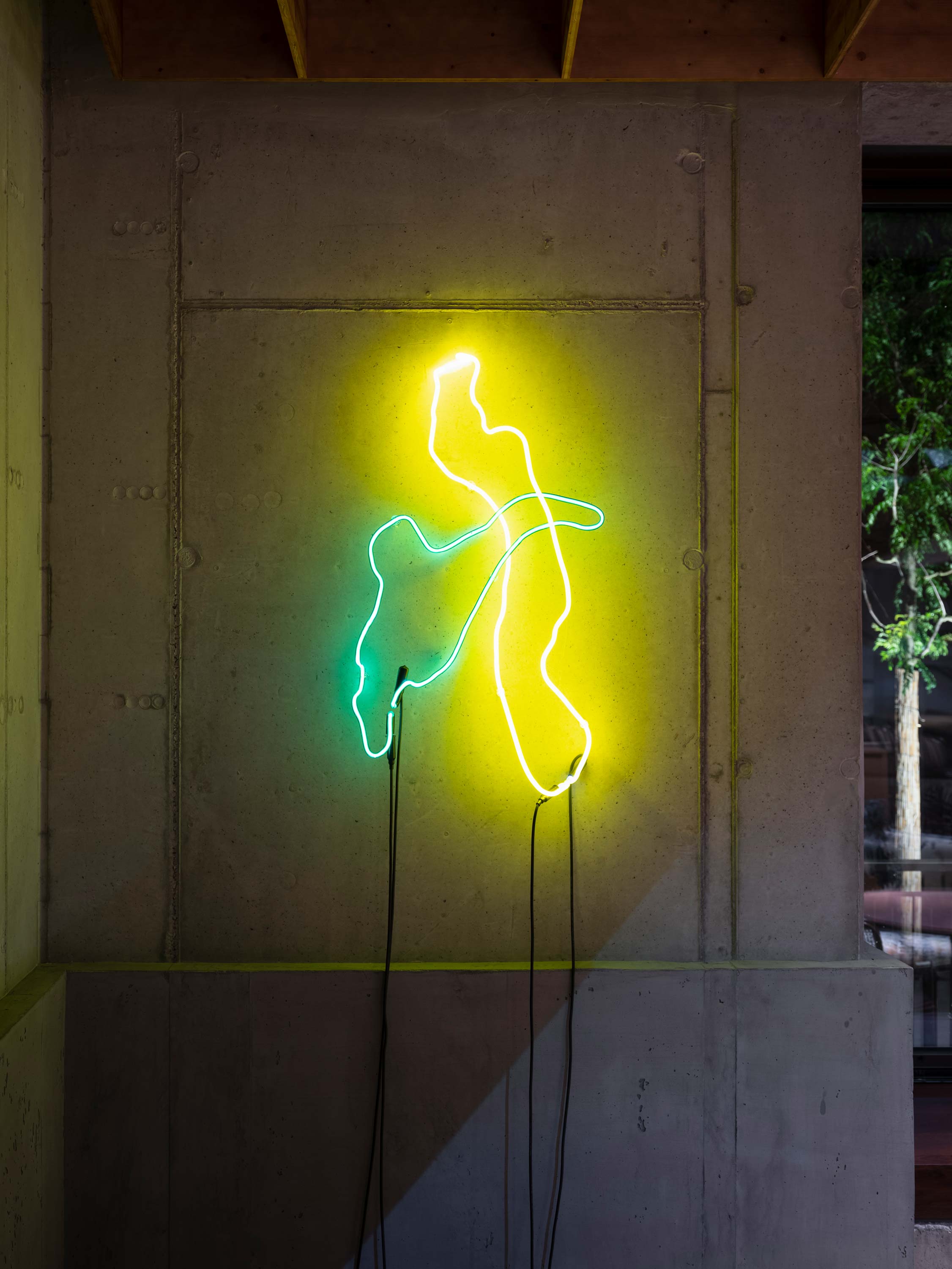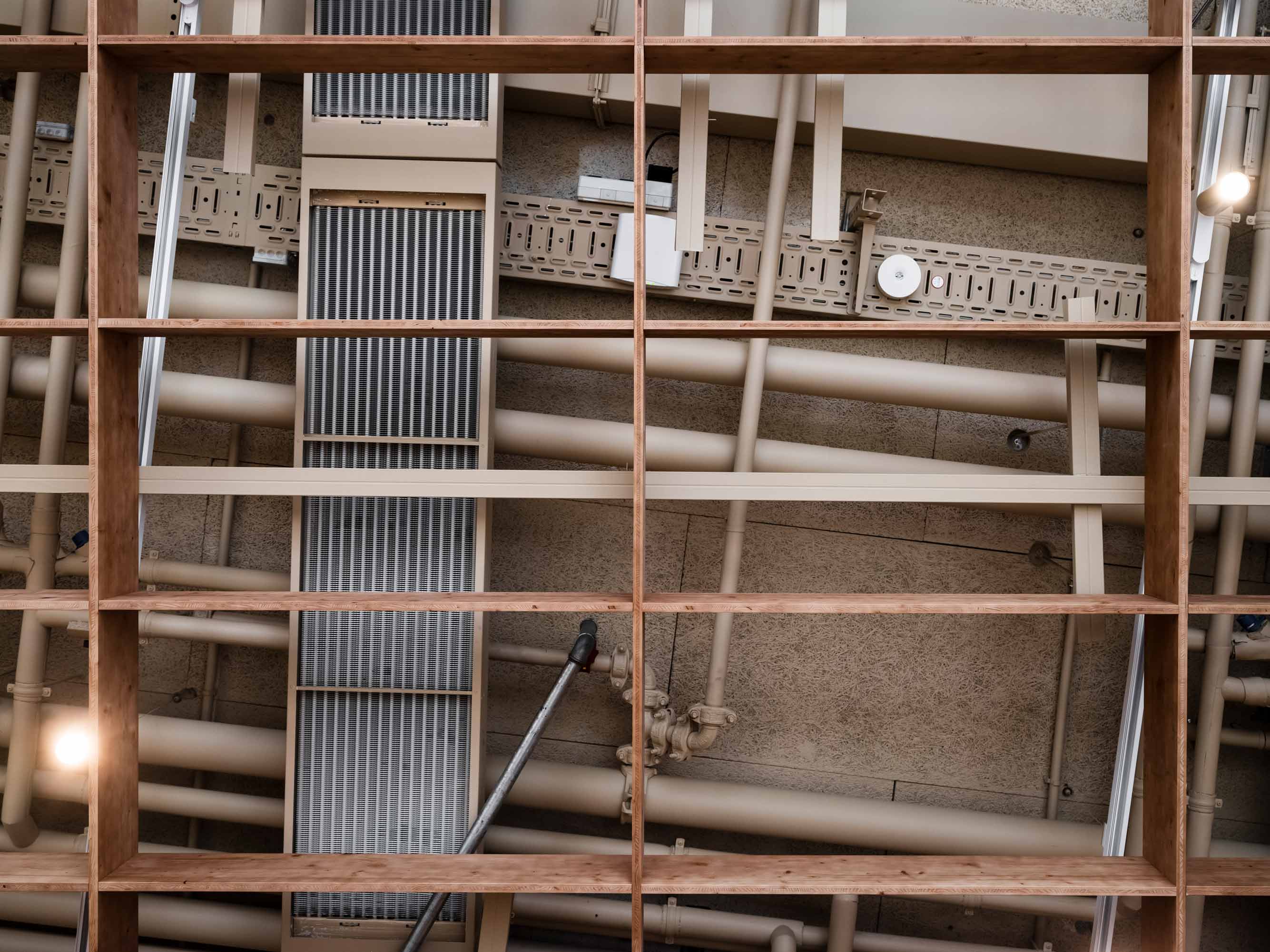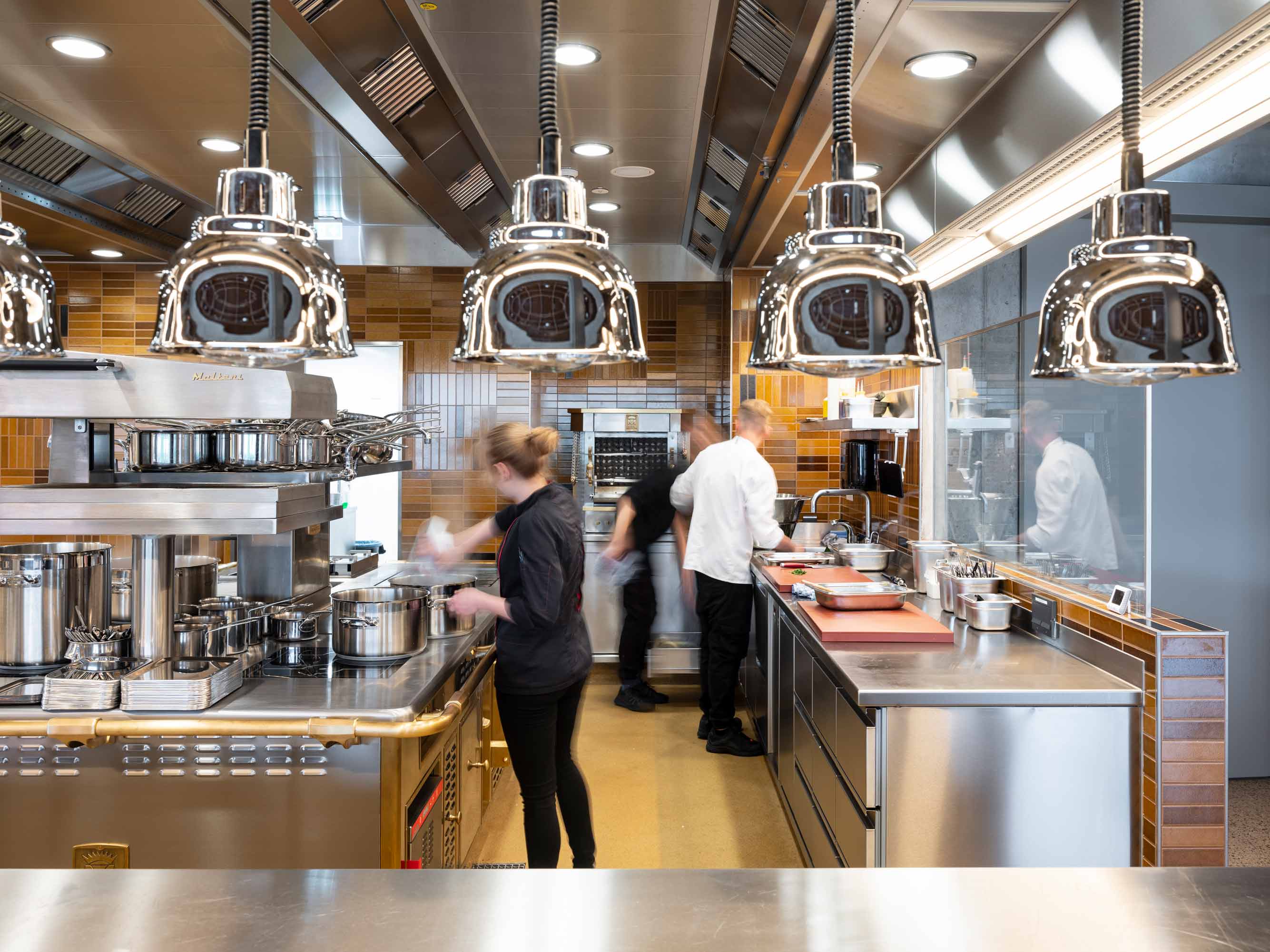 Durch die dramaturgische Raumabfolge und die von uns entworfenen Polsterbankreihen und -nieschen werden den Gästen außerdem vielfältige Sitzatmosphären geboten. Im hinteren Bereich bietet ein großzügiger, langer Tisch Platz für Gruppen von bis zu 12 Gästen. Auch in der Brasserie lehnen sich der Boden aus geschliffenem Gussterrazzo und die orthogonalen Raster der Decke an die Lobby des Hotel Karl August und das Café Piqué Niqué an.