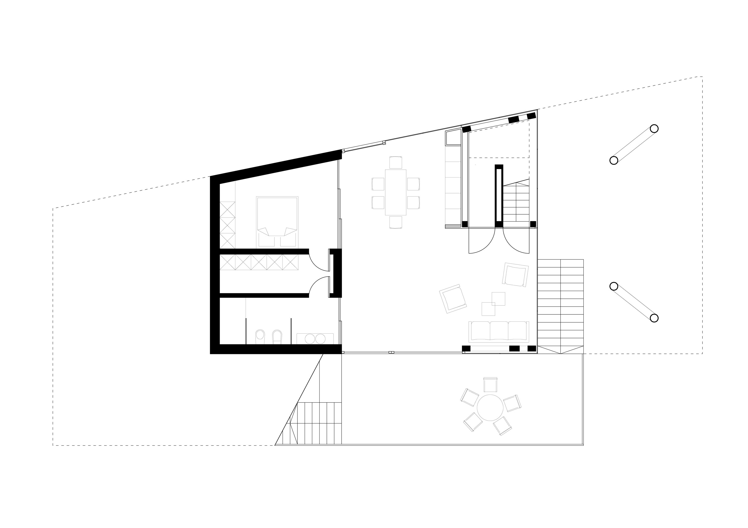 Das Haupthaus und damit der größte Gebäudekörper wird aufgrund der extremen Hanglage straßenseitig ebenerdig ‚von oben’ durch ein Eingangsgebäude und über eine Brücke erschlossen. Der Gebäudekörper des Haupthauses ragt aufgrund der steilen Topographie in das Tal und wird talseitig mit Stützen abgefangen und rückseitig mit den massiven Stützwänden der Terrassen verankert. Der Hauptbaukörper schwebt so über der untersten Ebene, die eine verglaste Einliegerwohnung beherbergt.