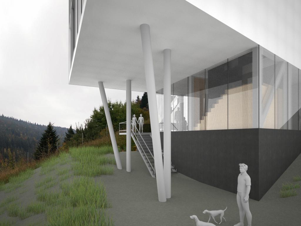 Das Gebäude orientiert sich straßenseitig zur Panoramastraße und talseitig in die Tiefe des Grundstücks zum offenen Panorama über Bad Wildbad. Die Gebäudeseiten sind weitestgehend zurückhaltend mit Öffnungen versehen, um die nötige Privatsphäre zu der Nachbarbebauung zu gewährleisten, wohingegen die Front- und Rückseiten sich mit großen Panoramafenstern zum Tal bzw. Berg hin öffnen. Die Basis des Hauses bildet eine ausformulierte Terrassenlandschaft, die zwischen den einzelnen Gebäudeteilen und dem recht steil abfallenden Terrain vermittelt.