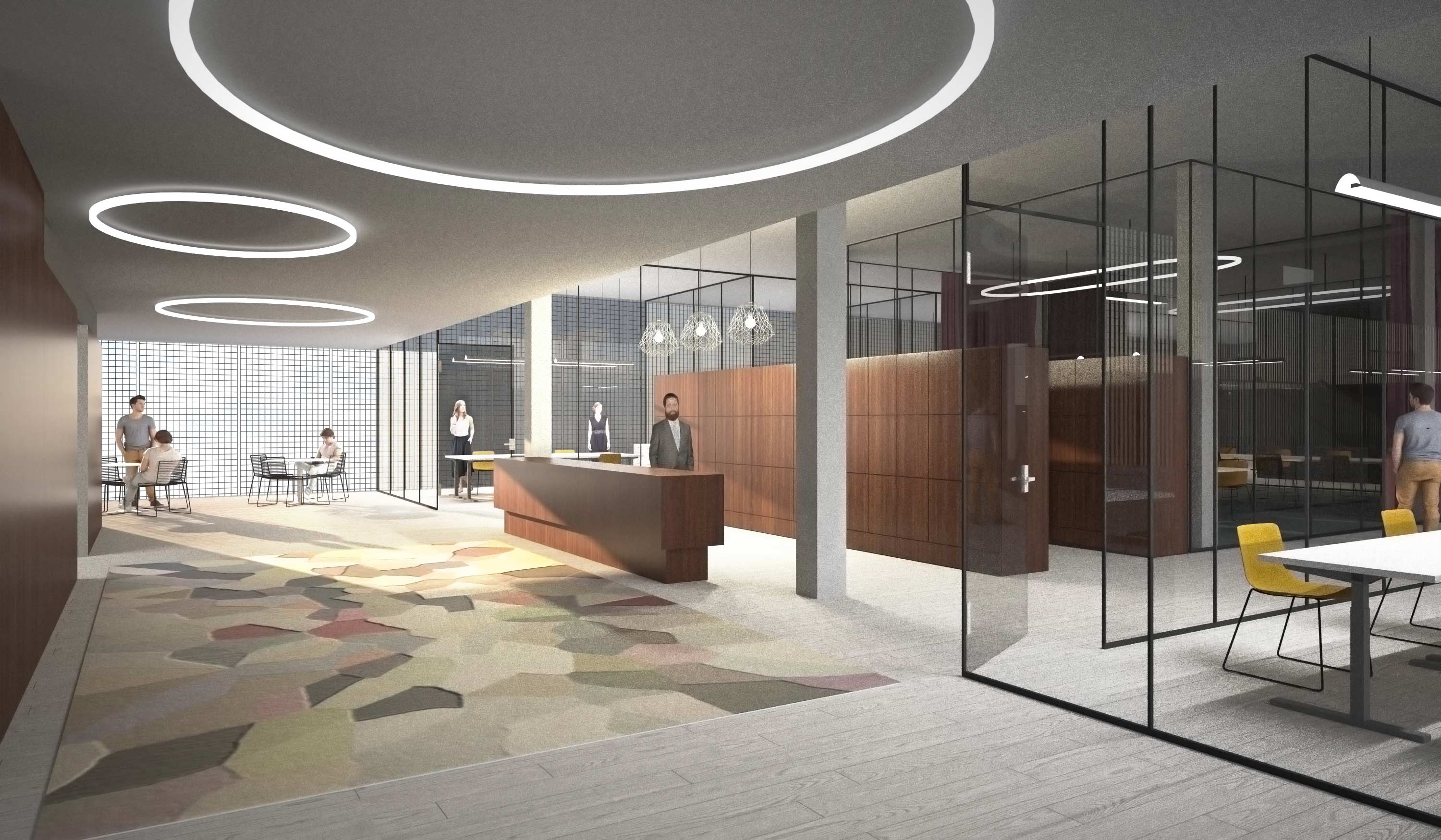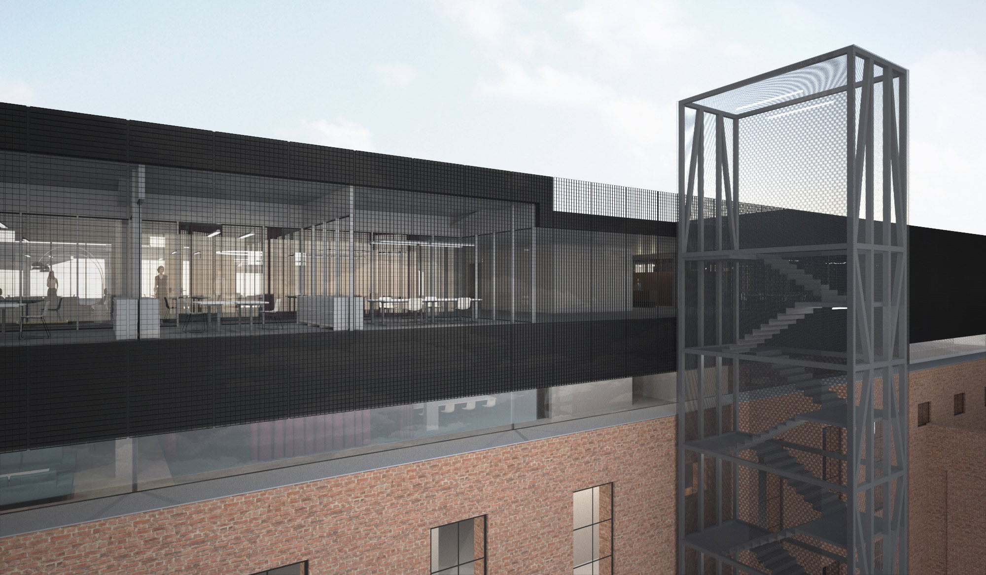 Der lang gestreckte Baukörper der Aufstockung ist aus zwei Volumina zusammengesetzt, wobei das untere einer Schattenfuge gleich das obere zum schweben bringt. Das untere Geschoss ist leicht in das Bestandsgebäude eingelassen, so dass sich für den oberen Baukörper eine proportional größere Gewichtung ergibt. Die Außenhaut des Gebäudes besteht aus schlichten, großen vertikalen Glaspaneelen, die äußerlich durch eine Verkleidung des Baukörpers durch Gitterroste ein mattes und semitransparentes Erscheinungsbild erhält.