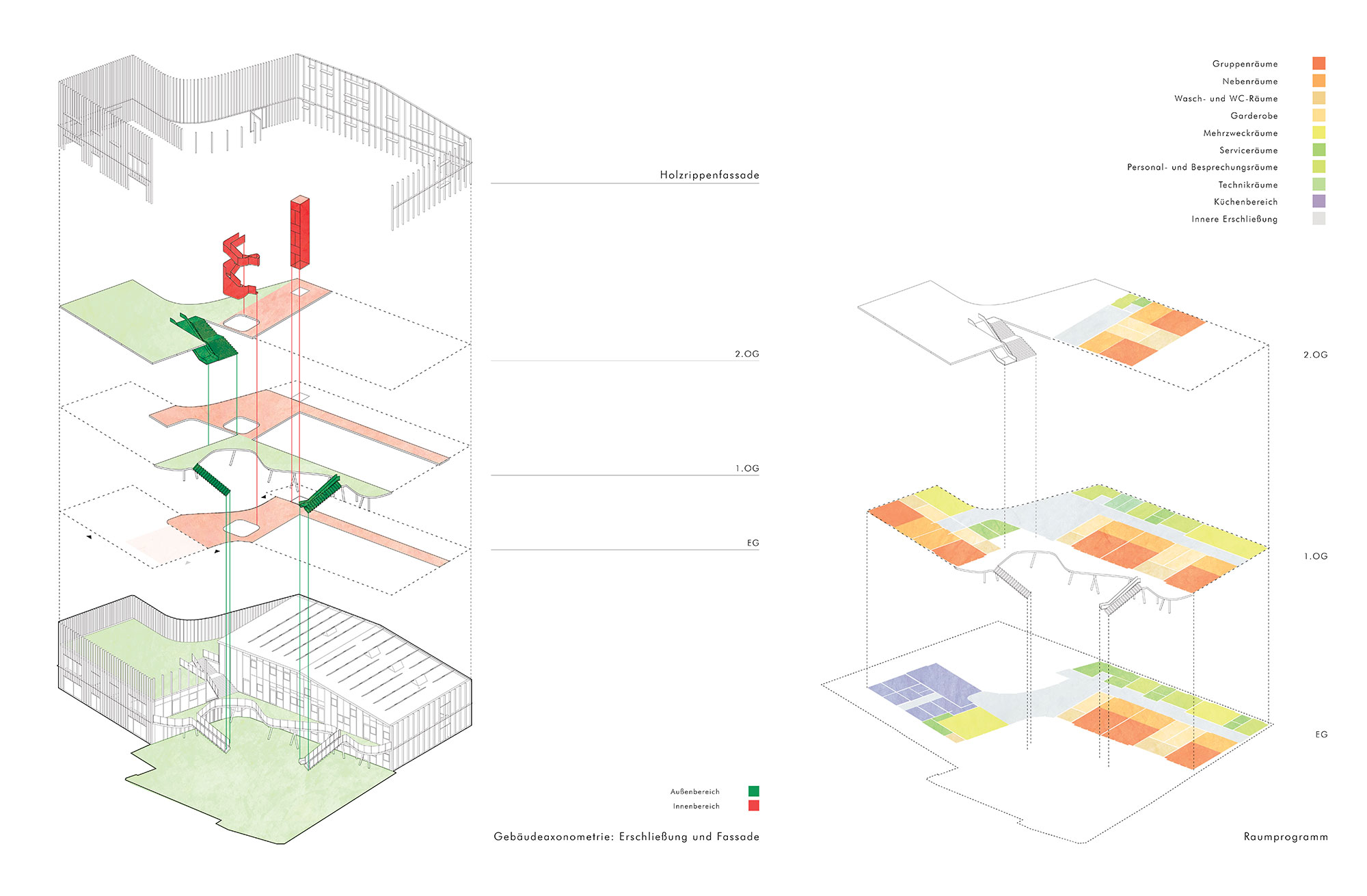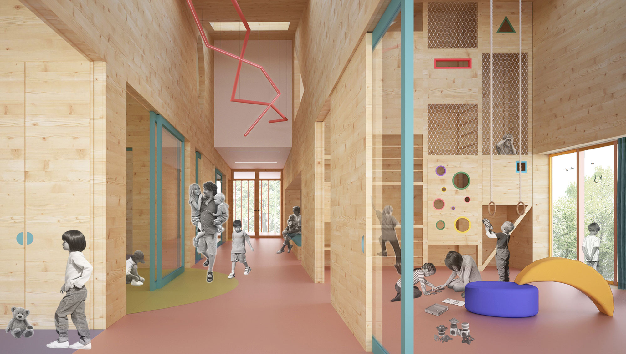 The two geometric building volumes are surrounded by a flowing architectural skin consisting of vertical wooden ribs, which vary in rhythm and spacing depending on the sun orientation. It functions as a constructive shading element, a structure for the windows, a façade element and a trellis for the greening of the façade. The design places great emphasis on a holistic sustainable concept. This is reflected in the environmentally friendly and renewable raw materials, the high degree of prefabrication potential, the self-sufficient energy generation and the natural thermal insulation. This ensures building an ecological, healthy, durable and energy-efficient environment for the children.